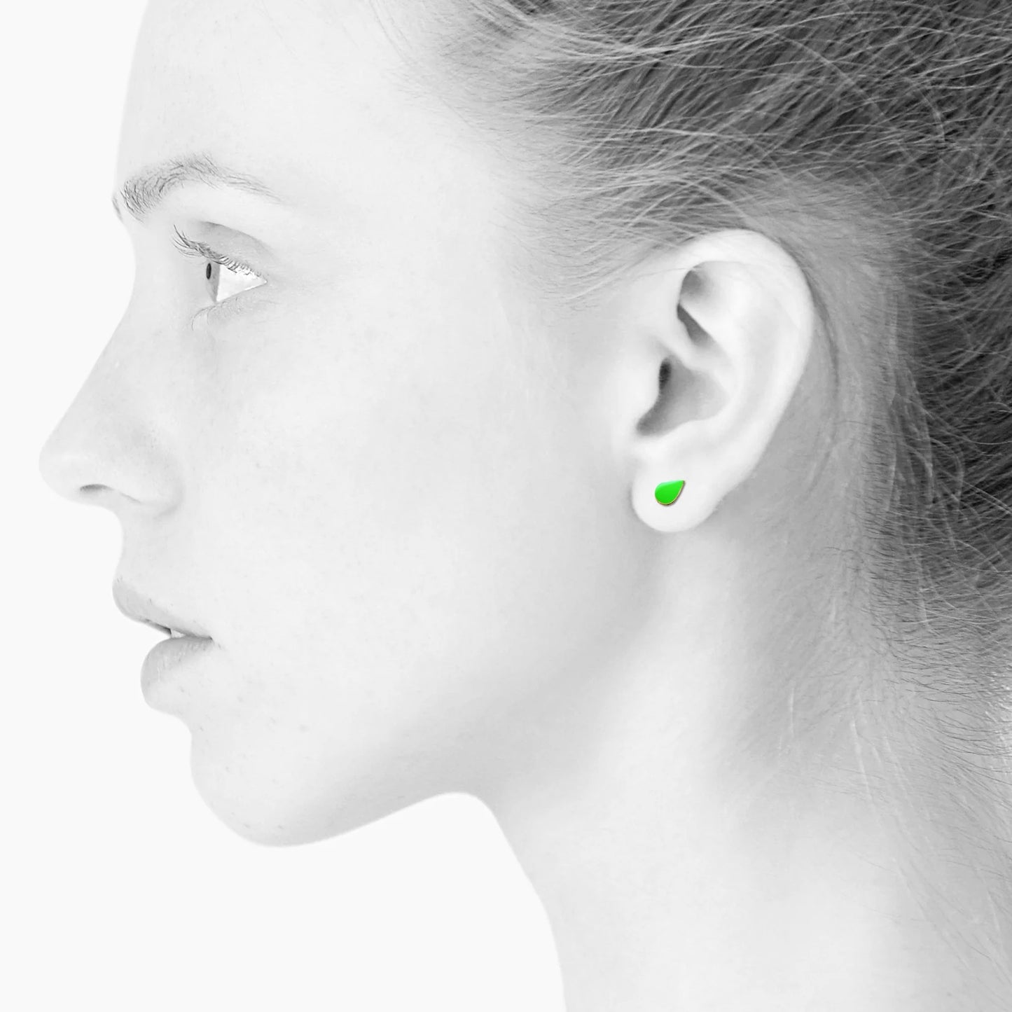 Small classic drop-shaped Spot ear studs with enamel lacquer in fluorescent spring green. Perfect for mixing with other ear studs.