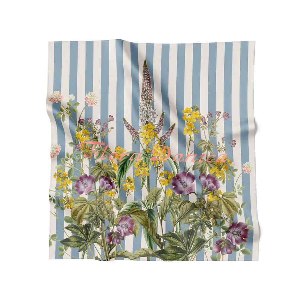 Striped Flower Meadon silk scarf. 100% silk. Blue, white and yellow. Flora Danica Denmark